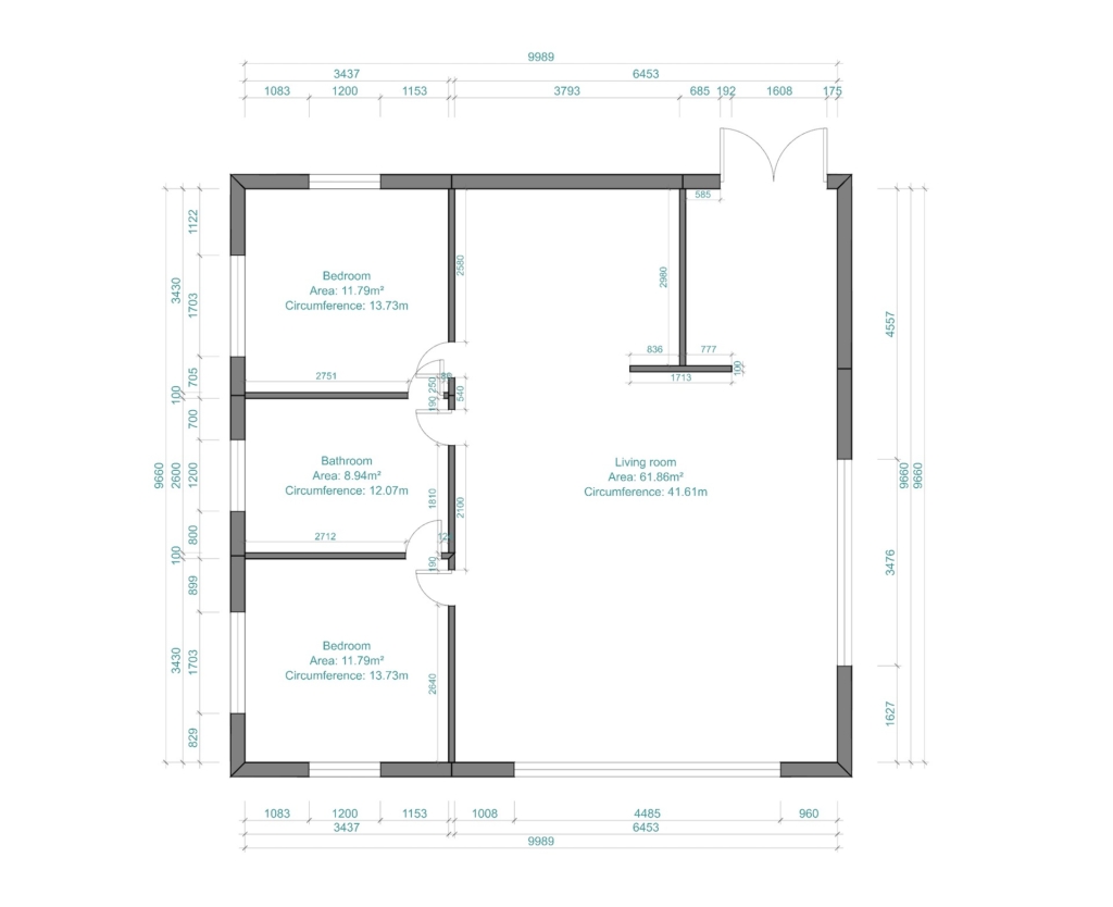 This well-proportioned villa delivers two 11.79 m² bedrooms, a full bathroom, and a sprawling 61.86 m² living/dining area perfect for relaxation and entertaining. High ceilings and an efficient rectangular plan maximize daylight while keeping costs down. Ideal for small families or couples who enjoy hosting, this layout balances private sleeping quarters with generous communal space.